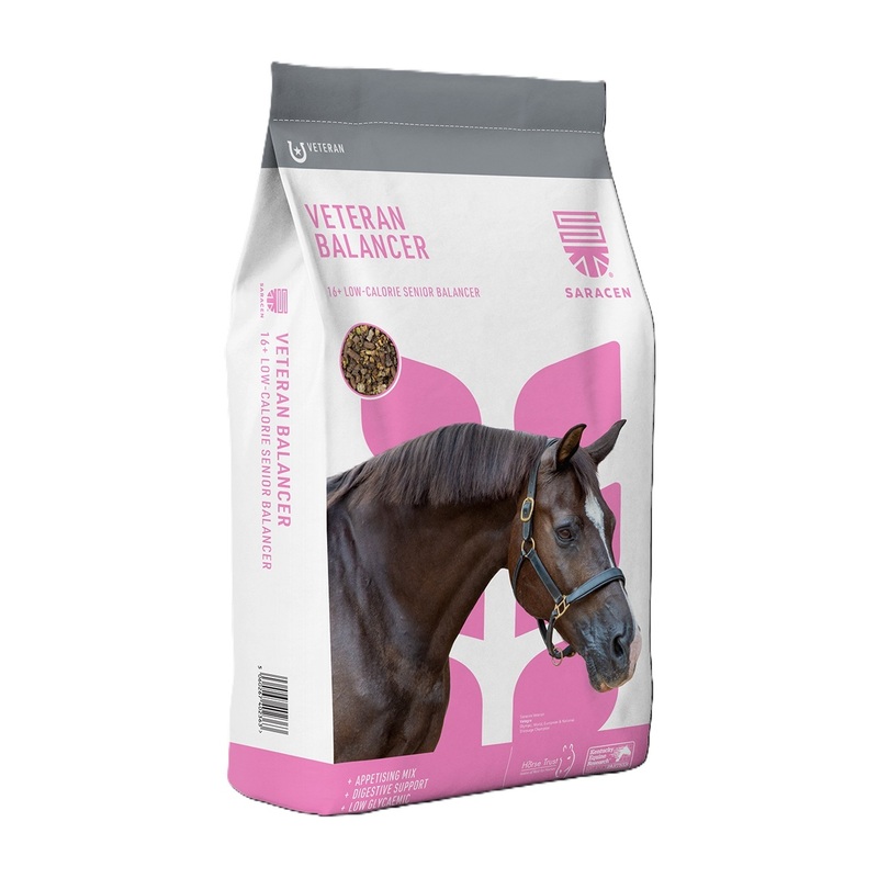 Veteran Balancer is suitable for:  Older horses and ponies at rest or in light to medium work who require a low calorie, low starch and low sugar diet # Older horses and ponies that are #good doers# but who are also more at risk to metabolic disease such as laminitis or EMS # Older horses and ponies who are not in work but those who maintain their weight well on smaller intakes of feed # Use as a two-part feeding system alongside Saracen Horse Feeds Veteran Mash # Horses and ponies requiring slow release, stamina based energy # Fussy feeders or those with limited appetites Features and benefits: # High in fibre, low in starch and sugar # Balanced with vitamins and chelated minerals, as well as optimum antioxidant support and healthy hoof package # Contains a live yeast for optimum digestive health and costeffective feeding # Includes linseed # a good source of Omega 3 fatty acids to support joint health and mobility # Includes a mycotoxin binder to provide additional digestive support to those horses and pon